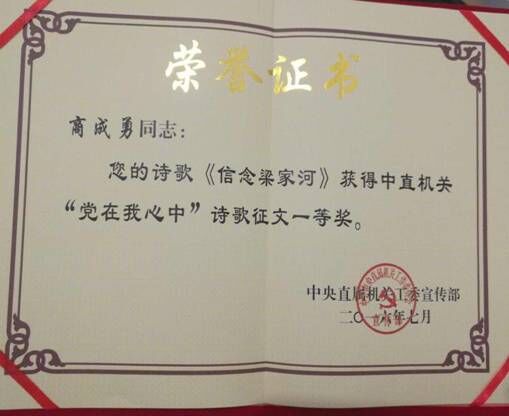 由商成勇創(chuàng)作的《信念梁家河》日前獲得中直機(jī)關(guān)“黨在我心中”詩(shī)歌征文一等獎(jiǎng)。在收到獲獎(jiǎng)證書(shū)后,他激動(dòng)地說(shuō):“這個(gè)分量很重的證書(shū),說(shuō)明謳歌時(shí)代、謳歌黨、謳歌我們黨的干部在艱難困苦環(huán)境中堅(jiān)定信念,帶領(lǐng)群眾努力脫貧的奮斗精神受到肯定。同時(shí),主旋律與正能量作品永遠(yuǎn)有市場(chǎng)和受眾。”