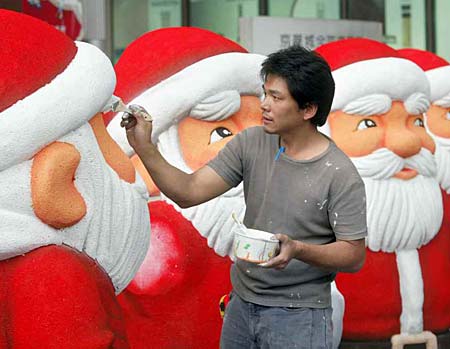 臺(tái)北市街頭近來陸續(xù)開始妝點(diǎn)圣誕樹及圣誕老人等相關(guān)應(yīng)景物品,一家百貨業(yè)者在戶外廣場(chǎng)樹立可愛的圣誕老公公模型,工作人員正仔細(xì)為保麗龍制的作品上色,為漸冷的街頭點(diǎn)綴些許喜慶與溫馨。(據(jù)臺(tái)灣《中國(guó)時(shí)報(bào)》報(bào)道)