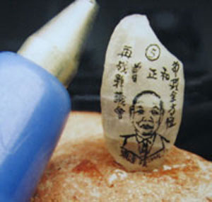 中新網(wǎng)11月30日電 據(jù)臺(tái)灣媒體報(bào)道,臺(tái)北縣新店毫芒雕刻家陳逢顯在一粒米上刻了全球最小競(jìng)選文宣,為新店區(qū)國民黨縣“議員”候選人曾正和助選,米粒上有曾正和的像、競(jìng)選號(hào)碼5號(hào)、“市政全方位、再戰(zhàn)縣議會(huì)”字樣與陳逢顯的落款。