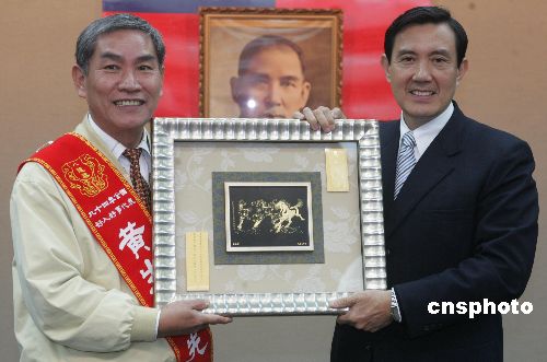 中國國民黨主席、臺(tái)北市長馬英九十二月十二日在臺(tái)北會(huì)見全臺(tái)好人好事“八德獎(jiǎng)”獲獎(jiǎng)代表時(shí),一位代表贈(zèng)送他一幅“九馬圖”,祝其前程遠(yuǎn)大。作者:宗金柱
