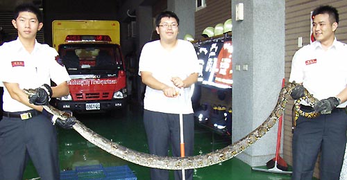 臺中市東英消防分隊昨天捕獲一條蟒蛇。(圖:東森新聞)
