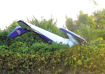 彰化縣芬園鄉(xiāng)貓羅溪畔農(nóng)地15日發(fā)生輕航機(jī)墜機(jī)意外,機(jī)上一男一女受重傷,經(jīng)警方調(diào)查后,證實(shí)機(jī)上男女分別為航天公司老板褚信坤及妻子游鑫桂,肇事原因不明 來源:臺(tái)灣《中國時(shí)報(bào)》