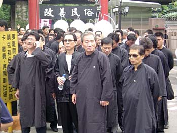 據(jù)臺灣中時電子報(bào)報(bào)道,2005年5月,在島內(nèi)素有“黑道仲裁者”之稱的“蚊哥”許海清舉行喪禮,全臺各幫派動員上萬人以“輸人不輸陣”的氣勢,身著各幫派及堂口制服,甚至以“黑色人龍”之姿繞街游行臺北街頭,甚至高調(diào)的舉辦記者會,訂定“黑道平安日”,讓警方顏面無光。臺“警政署”最后施以鐵腕,日后的任何一場黑道份子喪禮,均事前強(qiáng)力約制幫派份子參加,甚至強(qiáng)力掃蕩,昔日黑道喪禮的風(fēng)光,幾乎已不復(fù)見。