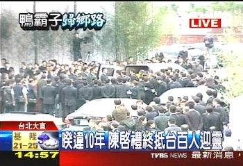 陳啟禮的喪禮上來自臺灣與香港的黑衣男女等數(shù)百人迎接。(圖:臺灣TVBS)