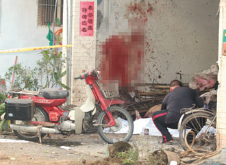 臺灣屏東縣恒春鎮(zhèn)昨天下午發(fā)生爆炸案,趙進玉在敲打撿回的炮彈時被炸死。墻上噴濺的血漬,令人觸目驚心,現(xiàn)場一片狼藉!。ㄅ_灣《聯(lián)合報》圖片)