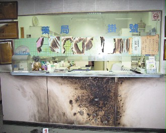 臺中縣男子施茗杰引火自焚,診所柜臺下方遭火燒焦一片。