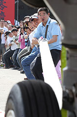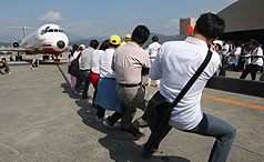 員工組則顯得有備而來,穿著整齊制服,當(dāng)30名選手還拉不動時(shí),遠(yuǎn)航董事長樂大信和總經(jīng)理陳尚群也加入拔河,直到40人終于拖動飛機(jī),多位選手大呼好玩。