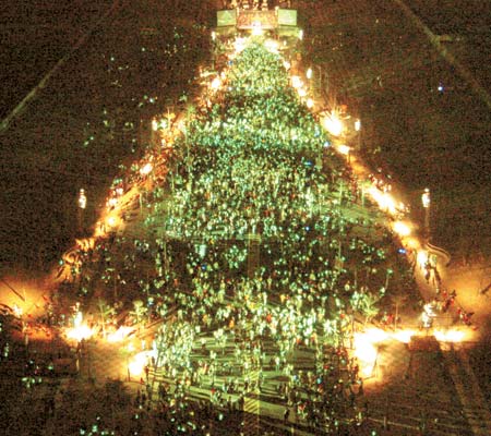 在臺灣省高雄市夢時(shí)代廣場旁的時(shí)代大道上,一場“萬輪壓馬路、排棵圣誕樹”活動(dòng)正在舉行。只見五萬人騎自行車或踩直排輪游行后,在時(shí)代大道上聚集排出一棵長兩百米、寬八十米號稱世界最大的圣誕樹,場面相當(dāng)壯觀。臺灣《中國時(shí)報(bào)》圖