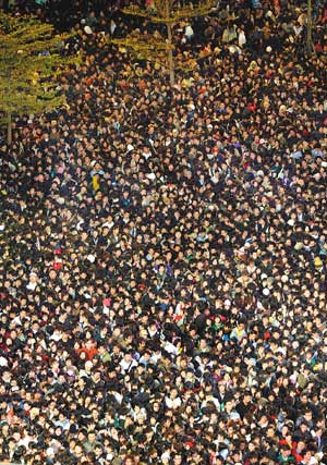 參加昨晚在臺北市政府舉行的“2008臺北最High新年城”跨年晚會的民眾,將舞臺附近擠得水泄不通。(聯(lián)合報圖)