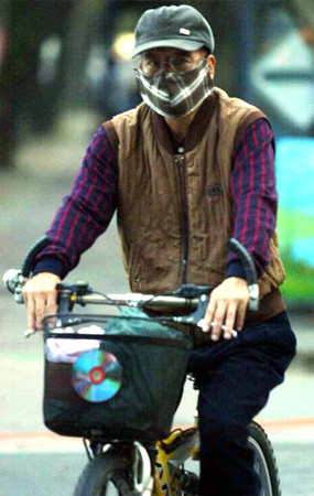 圖為一位民眾九日戴著口罩在中山紀(jì)念館騎車運動,以免受到污濁空氣的影響。圖:臺灣《中國時報》
