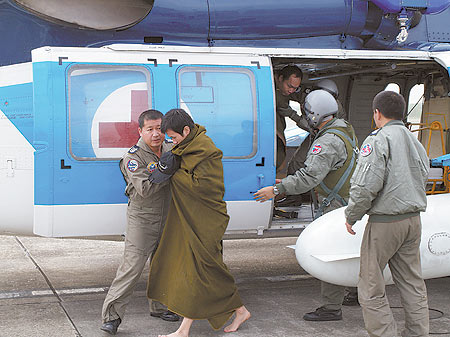 圖為海鷗直升機(jī)將船員平安救抵機(jī)場(chǎng)。圖:臺(tái)灣《中國(guó)時(shí)報(bào)》
