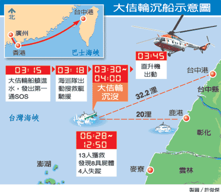從廣州經(jīng)香港欲前往臺(tái)中港的巴拿馬籍貨輪“大佶輪”,昨天凌晨在臺(tái)灣地區(qū)彰化縣鹿港附近二十海浬處受巨浪侵襲,船頭傾斜入水,十五分鐘后開始沉沒,有二十五名大陸籍船員及船工落海。臺(tái)灣搜救中心出動(dòng)三艦、四艇及七架直升機(jī),救起十三人,另發(fā)現(xiàn)八具尸體,還有四人失蹤。