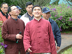 臺(tái)北市陽明山花季二日正式開幕,市長郝龍斌(前)身著唐裝上山賞花。