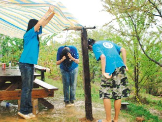 紀蜜俐在印度邊境村落當志工,因水資源珍貴,臺灣的志工擔心浪費當?shù)貎λ,不敢洗澡,臺風前下了一場大雨,大伙興奮地在雨中洗頭。 聯(lián)合報圖