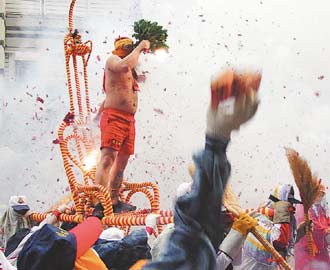 元宵炸寒單爺活動越夜越瘋狂,炮手拿著鞭炮往寒單爺神轎丟。 聯(lián)合報圖