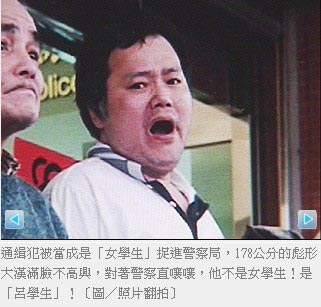呂學(xué)生被當(dāng)成是“女學(xué)生”捉進(jìn)警察局,身高178厘米的彪形大漢滿臉不高興,他對(duì)著警察直嚷嚷,說他不是“女學(xué)生”。