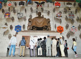 臺當局推行“去蔣”政策,臺北中正紀念堂的蔣介石銅像被各式風箏遮擋。4月1日起風箏等將全部拆除,還大廳原貌。(圖:臺灣《聯(lián)合報》)