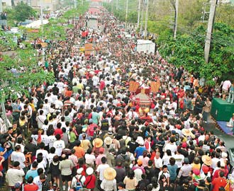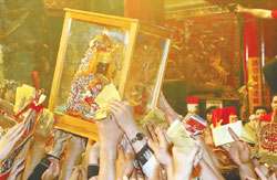 中新網(wǎng)4月14日電 經(jīng)過八天七夜繞境出巡,臺灣大甲媽祖神轎昨天回鑾到臺中縣大甲鎮(zhèn)。超過十萬名接駕信眾綿延十多公里。信眾的熱情,讓回鑾的預(yù)定時間比去年更延遲好幾個小時,家家戶戶備妥香案跪拜,鎮(zhèn)瀾宮深夜十一點(diǎn)舉行安座大典,場面盛大熱情。