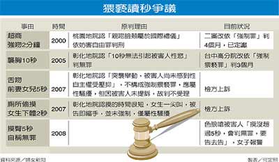 “襲胸十秒無罪事件”,發(fā)生在05年11月,彰化員林內衣特賣會上發(fā)生女子遭摸胸的事件,檢方依強制猥褻罪起訴后,彰化地院以10秒鐘無法引起加害人性欲為由,判定無罪。