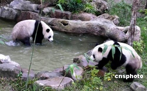 二月十四日,大陸贈臺大熊貓“團團”和“圓圓”首次在臺北新家的戶外展示場與游客見面,再度掀起臺灣民眾的參觀熱潮。當(dāng)天,“團團”“圓圓”到戶外活動的興致極好,常在草地上撒歡奔跑,“團團”樂山,不時爬到山坡的最高點俯視全場; “圓圓”喜水,不時走進水池戲水玩耍。圖為“團團”“圓圓”在戶外展場的水池內(nèi)戲水玩耍。 中新社發(fā) 路梅 攝