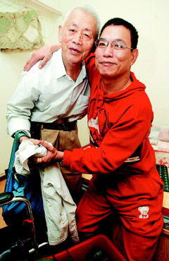 高齡87歲的胡偉爺爺(左)從小住孤兒院,在南京大屠殺劫后余生,30年來默默行善,昨天他捐款幫助行動不便的蔡行展(右),兩人相擁如同父子。 臺灣聯(lián)合報圖