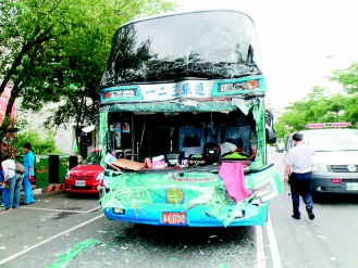 臺中縣東勢鎮(zhèn)慈蓮慈惠堂進香團游覽車追撞,14人輕傷。圖片來源:臺灣《聯(lián)合報》