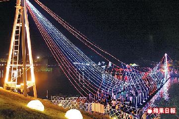 為慶祝七夕情人節(jié),主辦單位特地在公園搭起由浮筒建造,長65公尺、寬6公尺,橋梁纜繩以七彩LED管燈布置,可容納150對情侶同時度過的“鵲橋”。