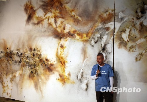 10月18日,國際爆破藝術(shù)家蔡國強(qiáng)在臺北華山創(chuàng)意文化園區(qū)公開進(jìn)行《晝夜》草圖的爆破制作。用3米高、32米長的畫作表現(xiàn)女舞者的人體與細(xì)膩的花草。雖說爆破過程中經(jīng)歷了3次點火,并留下了兩處小小的遺憾,但蔡國強(qiáng)對總體效果仍很滿意,稱“這次創(chuàng)作超越了之前的作品”。對于新作,蔡國強(qiáng)表示“想要挑戰(zhàn)并探索創(chuàng)作藝術(shù)形式上的可能”。 中新社發(fā) 李佳佳 攝