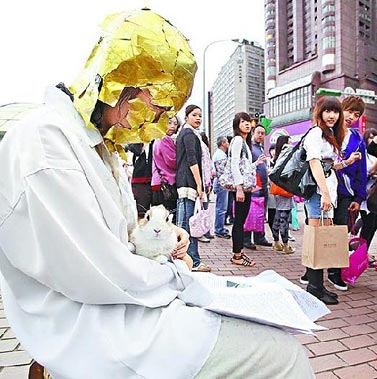 中國(guó)臺(tái)灣網(wǎng)10月26日消息 據(jù)臺(tái)灣《蘋(píng)果日?qǐng)?bào)》報(bào)道,繼用豬血在馬路上寫(xiě)字引發(fā)爭(zhēng)議后,臺(tái)灣藝術(shù)大學(xué)學(xué)生王思涵昨再度上演街頭行為藝術(shù),王思涵在臉上和頭發(fā)上涂滿蜂蜜,再黏上金色紙片,懷里抱著一只小兔子,獨(dú)坐在臺(tái)北巿人行道上,很多人直呼看不懂。