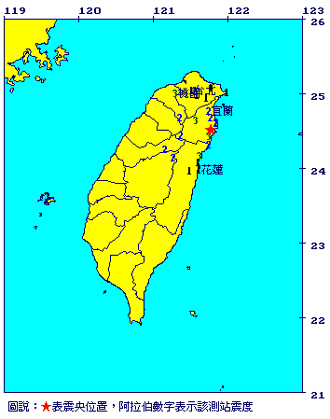 各地最大震度:宜蘭、花蓮、臺(tái)北和桃園為3級(jí),南投、臺(tái)中為2級(jí),臺(tái)北市和花蓮市為1級(jí)。(陳佳慧)