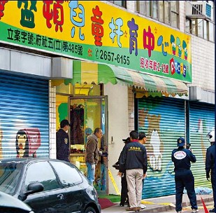 臺北市內(nèi)湖區(qū)華盛頓兒童托育中心女老師黃瓊瑤在門口被槍殺,留下大片血跡,警方現(xiàn)場采證。圖片來源:蘋果日報