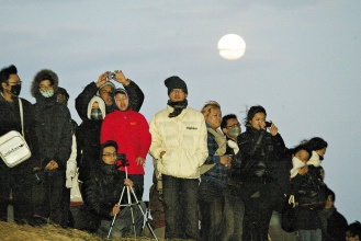 2010年第一天,屏東墾丁龍盤公園聚集上萬民眾前來迎接第一道曙光,大家冒著寒風(fēng)殷殷期待,與背后的月亮形成有趣對比。來源:臺灣《聯(lián)合晚報(bào)》