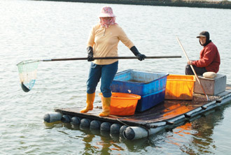 寒流趨緩,溫差大造成凍傷的魚死亡,云林沿海業(yè)者無奈撈起死魚。(圖片來源:臺灣《聯(lián)合報(bào)》)