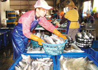 嘉義沿海這兩天凍傷的虱目魚數(shù)量龐大,漁民紛將虱目魚賣給加工業(yè)者,廠內(nèi)可見大批等待加工虱目魚。(圖片來源:臺灣《聯(lián)合報(bào)》)