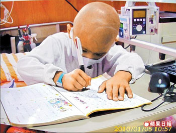 豆豆愛讀書,住院化療期間,學(xué)校老師也會到病床前教他功課。來源:臺灣《蘋果日報(bào)》