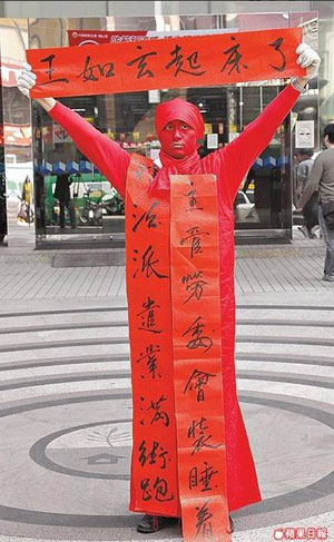 朱政騏昨早潛入“勞委會(huì)”大樓,想到各樓層貼“恭賀新禧/請(qǐng)關(guān)心派遣臨時(shí)工”標(biāo)語春聯(lián),卻因多數(shù)樓層大門上鎖,只能在未上鎖的十樓男廁內(nèi)貼一張;隨后他全臉涂紅、身穿紅衣、頭綁紅頭巾,身掛“非法派遣業(yè)滿街跑”、“主管勞委會(huì)裝睡著”對(duì)聯(lián),高舉“王如玄起床了”橫批,向臺(tái)“勞委會(huì)”嗆聲。