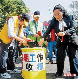 中國(guó)臺(tái)灣網(wǎng)2月11日消息 據(jù)臺(tái)灣《蘋果日?qǐng)?bào)》報(bào)道,臺(tái)灣60多萬名失業(yè)者年關(guān)難過。曾吃牛糞抗議美國(guó)帶骨牛肉進(jìn)口的臺(tái)灣大學(xué)社會(huì)所博士生朱政騏,昨潛入臺(tái)當(dāng)局“勞委會(huì)”貼標(biāo)語并扮“人肉春聯(lián)”,抗議派遣臨時(shí)工遭剝削、就業(yè)方案薪資過低;中高齡促進(jìn)就業(yè)聯(lián)盟20多人昨也到臺(tái)當(dāng)局“行政院”前,控訴短期就業(yè)計(jì)劃無助中高齡就業(yè)。