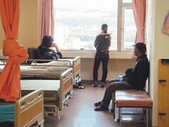 林姓出租車(chē)司機(jī)(左)和同居女友燒炭自殺獲救,他的大陸配偶(中)到醫(yī)院探視發(fā)現(xiàn)丈夫另有女人,痛苦遠(yuǎn)望;林父(右)也一臉無(wú)奈。來(lái)源:臺(tái)灣《聯(lián)合報(bào)》