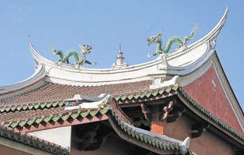 臺南市祀典武廟,拜殿屋脊上雙龍七層玲瓏寶塔震后只剩兩層,中間露出鋼筋。圖片來源:臺灣《中國時報》