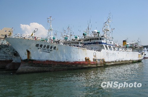 去年4月在西印度洋遭索馬里海盜挾持的臺灣遠洋漁船“穩(wěn)發(fā)161號”,歷經(jīng)各方營救,終于在遭挾持10個多月后,包括船長顏勝男等共28人返回高雄港。圖為“穩(wěn)發(fā)161號”現(xiàn)?扛咝矍版(zhèn)漁市場碼頭。 中新社發(fā) 耿軍 攝