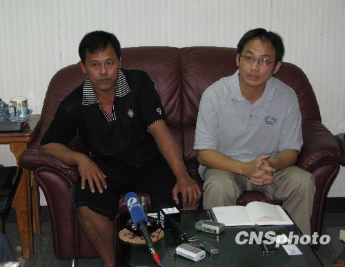 去年4月在西印度洋遭索馬里海盜挾持的臺灣遠洋漁船“穩(wěn)發(fā)161號”,終于在遭挾持10個多月后,經(jīng)大陸海軍526艦接護返回高雄港。圖為3月6日“穩(wěn)發(fā)161號”船長顏勝男(左)、穩(wěn)發(fā)漁業(yè)公司經(jīng)理劉銘復(右)在高雄接受大陸記者采訪,他們感謝大陸船東協(xié)會提供及時幫助、海軍提供柴油、伙食和護航。 中新社發(fā) 耿軍 攝