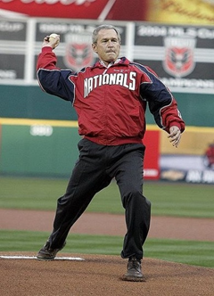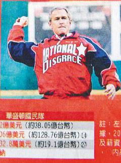 近期的臺灣《自由時報》體育版,放了一張布什幫華盛頓國民隊開球的照片,乍看之下沒什么特別,但仔細看球衣上的字竟是“NATIONAL DISGRACE”,NATIONAL代表著國家,DISGRACE可是代表著恥辱。其實2005年布什幫華盛頓國民隊開幕戰(zhàn)開球的畫面,胸前只有NATIONALS的字樣,因為真正的球衣就印著這幾個字。