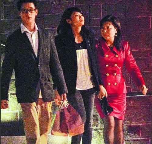 婚宴結(jié)束,蔣友青(左)、長(zhǎng)腿妹和媽媽蔣方智怡準(zhǔn)備搭車離去。圖片來源:臺(tái)灣《蘋果日?qǐng)?bào)》