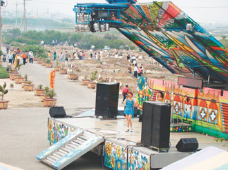 大型電子琴花車昨天下午停在嘉義縣東石鄉(xiāng)第四公墓納骨塔旁,穿著清涼的主持人說了幾句清明節(jié)祝福話,接著介紹表演女郎上臺,穿著藍色薄紗的女郎扭腰擺臀唱了兩首歌,隨即脫掉薄紗外套,露出比基尼舞臺裝繼續(xù)表演。