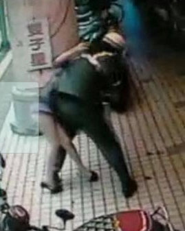 壯碩男警側摔壓制檳榔西施的畫面被路邊監(jiān)視器拍到。 來源:臺灣《蘋果日報》