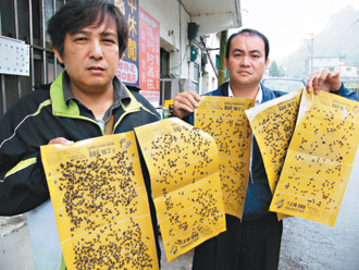 新竹縣尖石鄉(xiāng)新樂村水田部落最近陷入“蒼蠅危機”,圖為粘滿蒼蠅的黏蠅板。圖片來源:臺灣《聯(lián)合報》