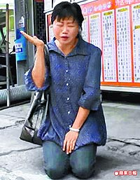涉嫌體罰女童的安親班主任,還曾入選臺中縣優(yōu)良老師,昨天面對家長,一時情急竟當(dāng)街下跪,自摑耳光,卻仍無法得到諒解。圖片來源:臺灣《蘋果日報》
