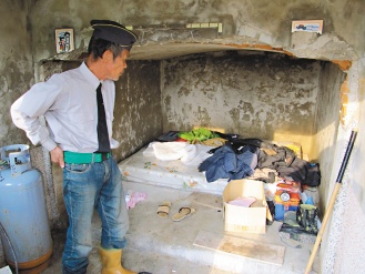 桃園縣黃姓男子窮困潦倒,春節(jié)期間住進(jìn)觀音鄉(xiāng)第一公墓廢棄祖塔,平常穿軍服、戴軍帽打零工。圖片來(lái)源:臺(tái)灣《聯(lián)合報(bào)》