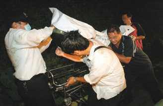 臺北縣爆發(fā)警消人員涉嫌與殯葬業(yè)者勾串大賺死人錢案,檢方昨天約談涉案人到案。圖為一般業(yè)者搬運(yùn)、處理浮尸遺體情形。圖片來源:臺灣《聯(lián)合報》