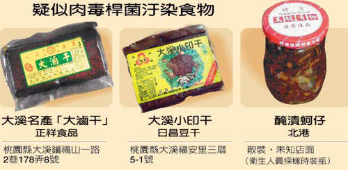 “食品藥物管理局”食品組副組長馮潤蘭說,已將可疑食品送驗(yàn),大約需要兩到三周,才能確知何種食品為禍?zhǔn)。馮潤蘭說,患者一人過世、一人插管治療中,無法得知散裝腌漬蚵仔來源;家中孫子也有吃少許豆干,未出現(xiàn)癥狀,而豆干仍在保存期限內(nèi),調(diào)查時被家人冷藏保存。